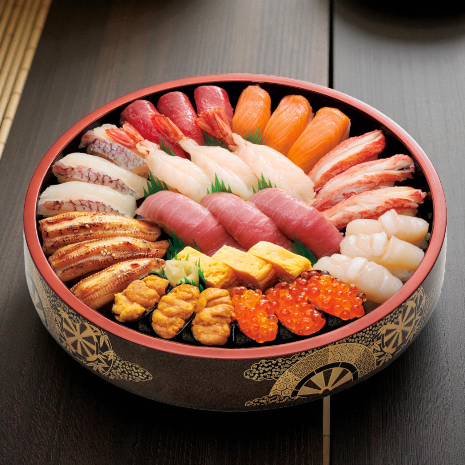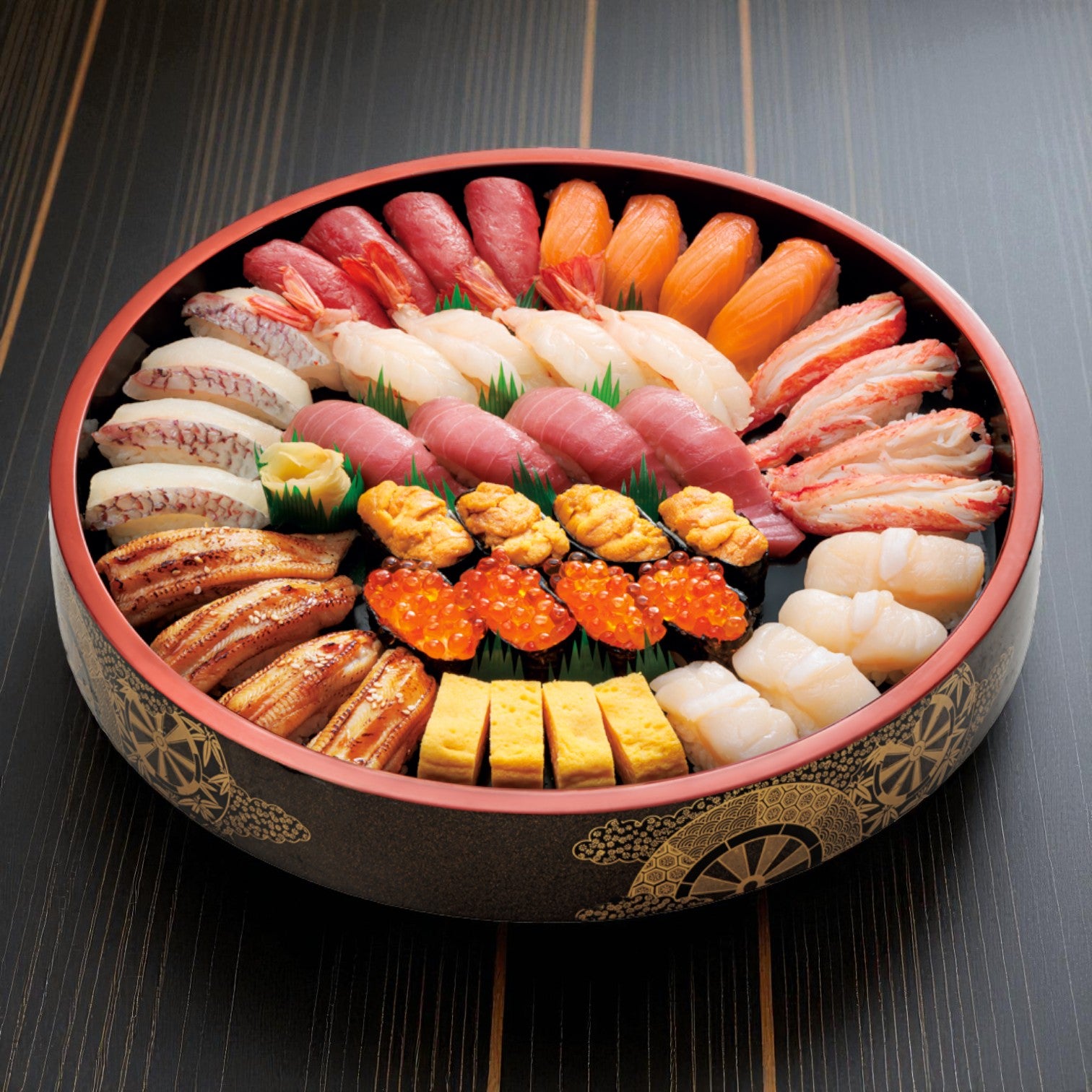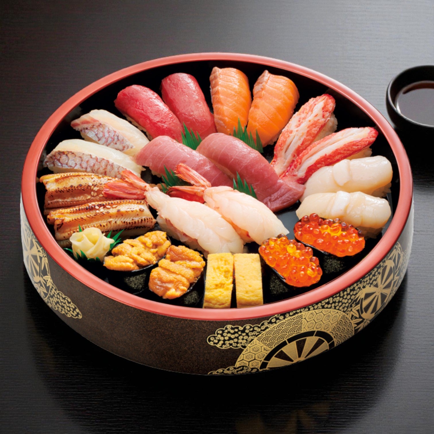 中トロ、北海道産ホタテ、サーモン、天草産真鯛湯引き、特上炙り穴子、本ずわいかに、大生えび、まぐろ、いくら軍艦、無添加うに軍艦、厚焼き玉子