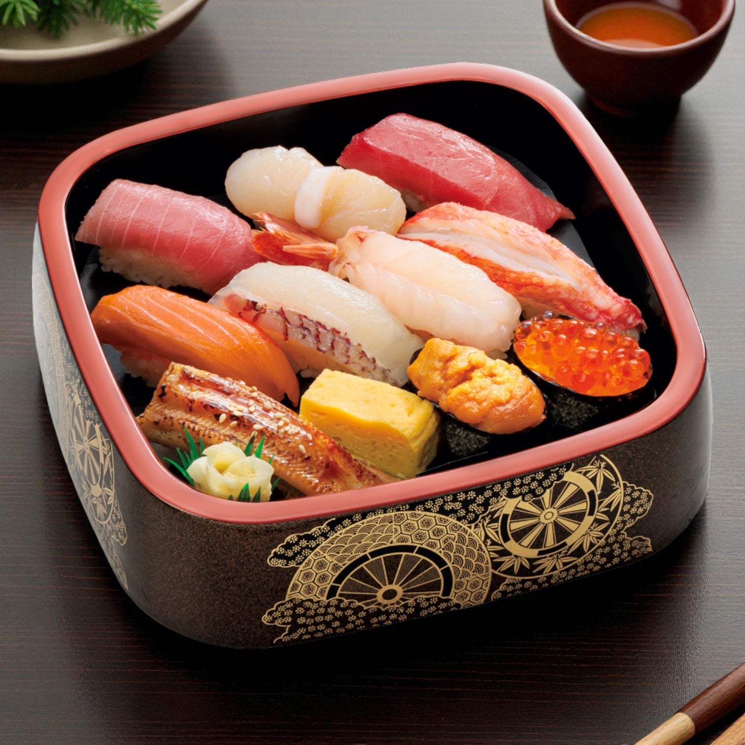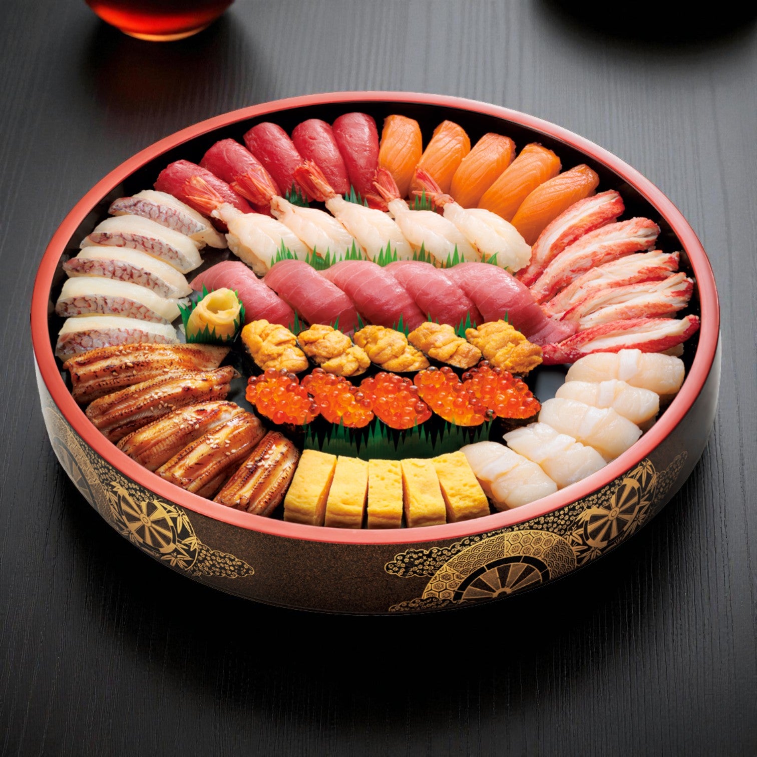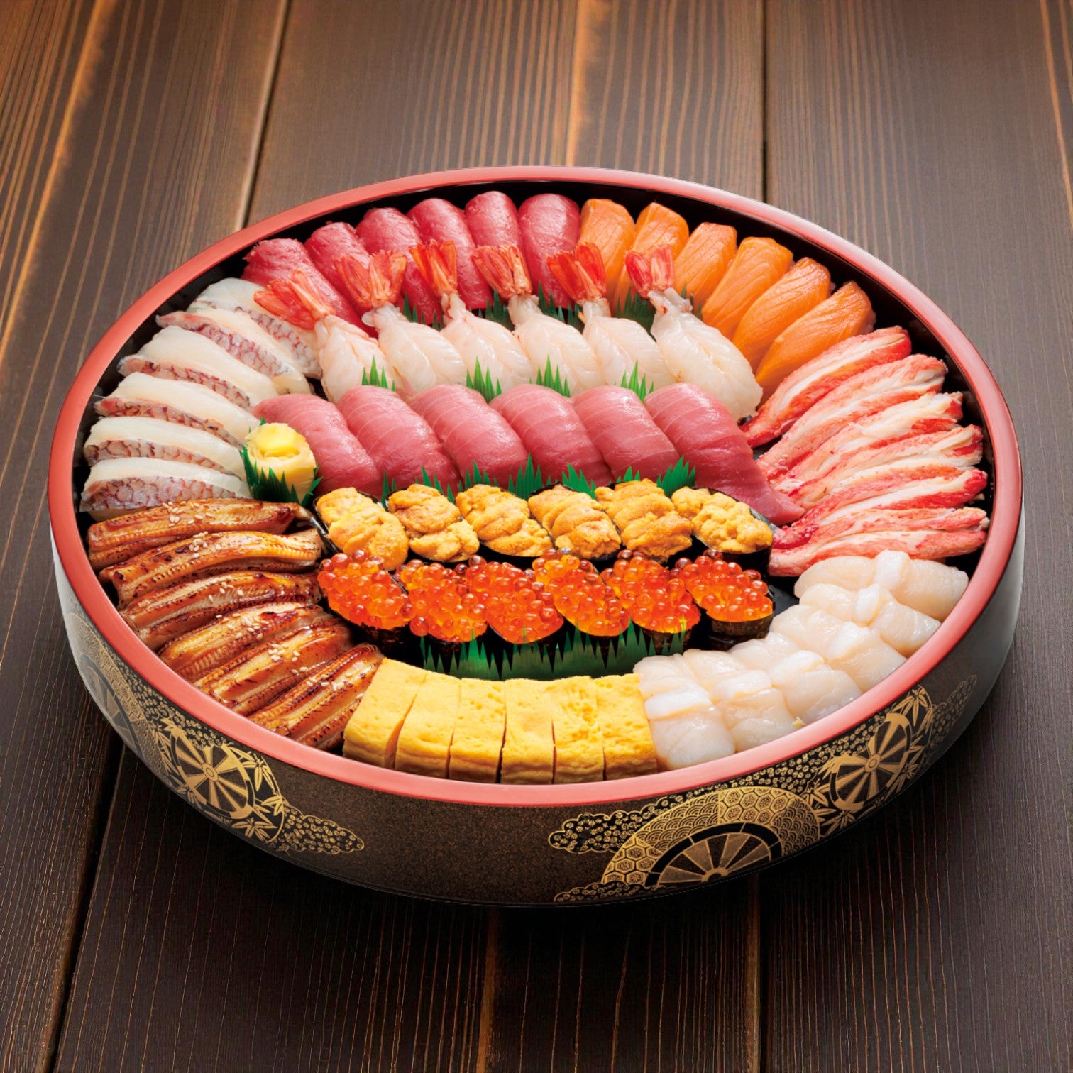 中トロ、北海道産ホタテ、サーモン、天草産真鯛湯引き、特上炙り穴子、本ずわいかに、大生えび、まぐろ、いくら軍艦、無添加うに軍艦、厚焼き玉子