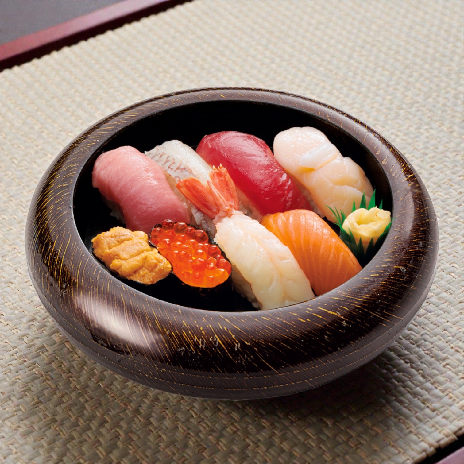 中トロ・天草産真鯛湯引き・まぐろ・北海道産ホタテ・サーモン・大生エビ・無添加うに軍艦・いくら軍艦